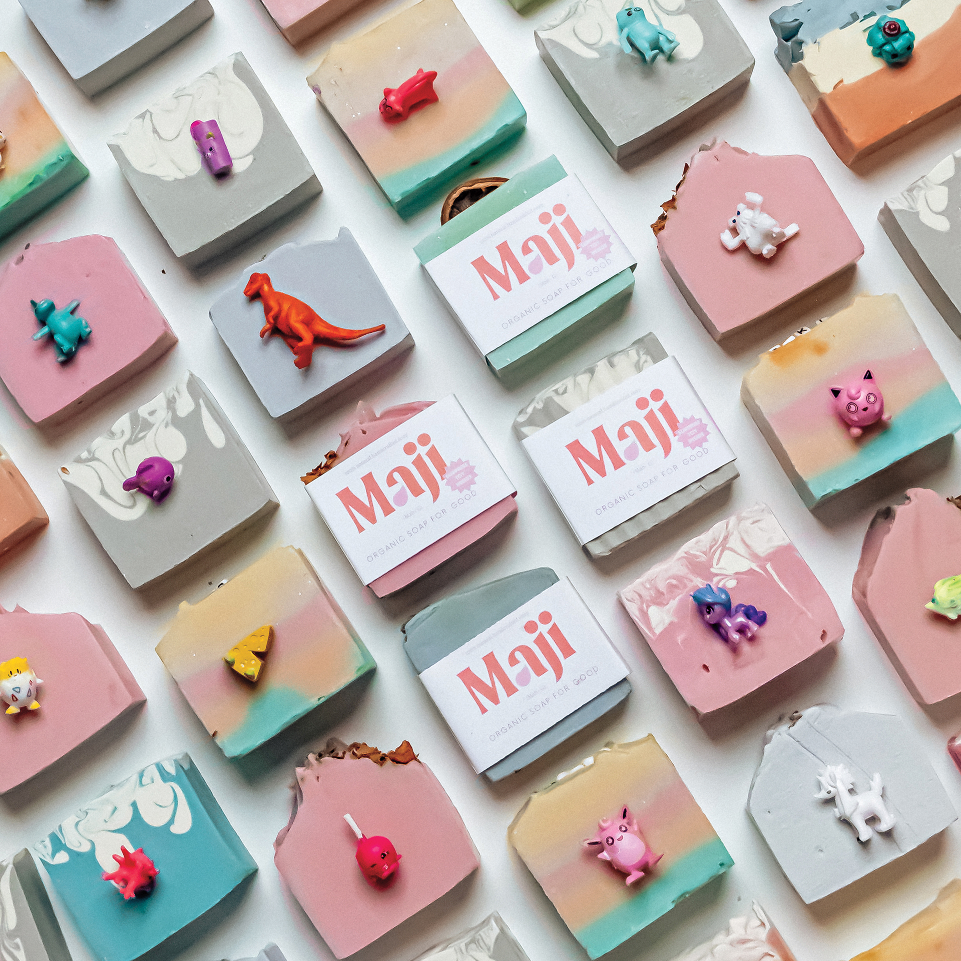 The affordable soaps—all less than $10—are sold at pop-ups inside boutiques and at local business fairs, as well as on Maji’s website. The Heal soap bars for adults contain a crystal instead of a toy.