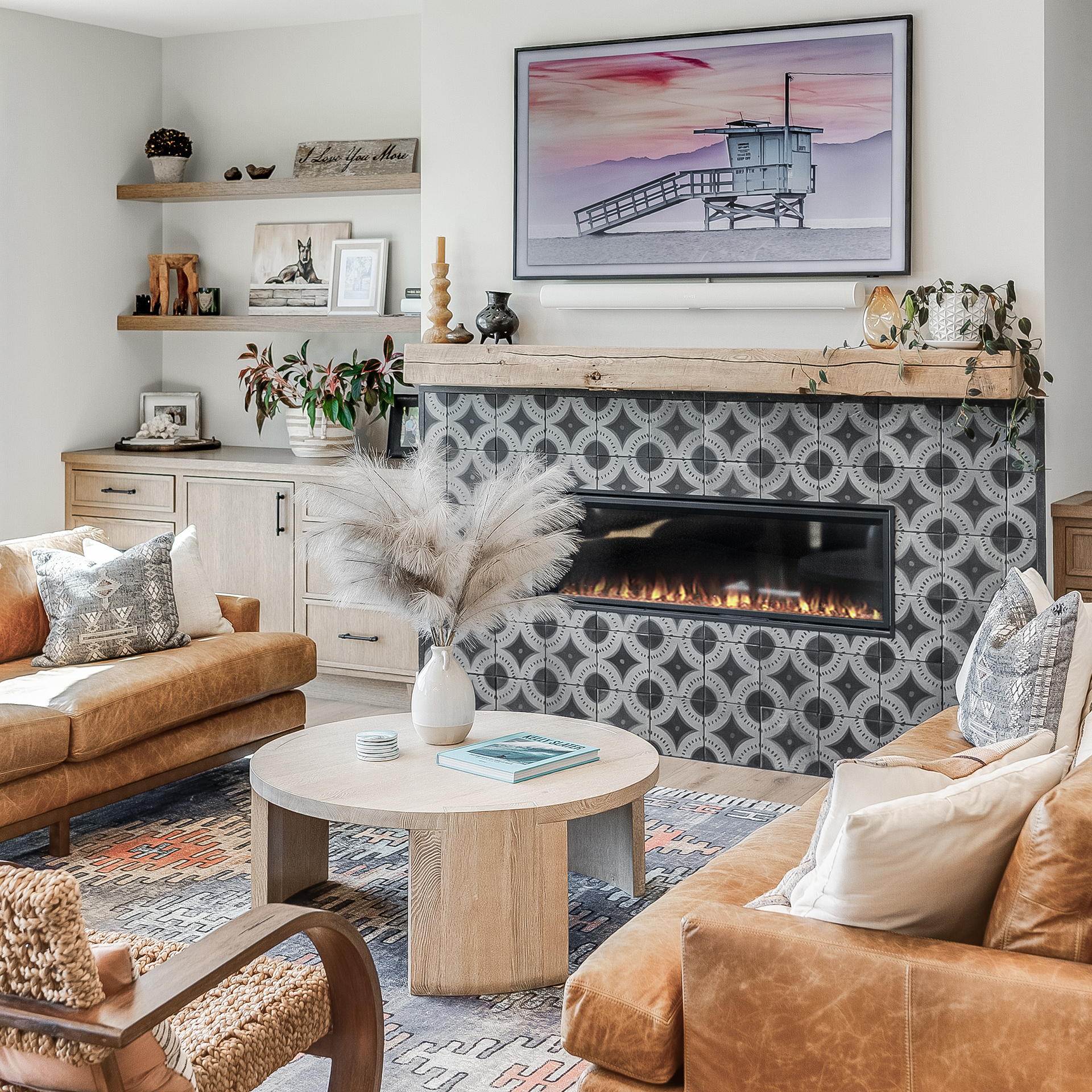Distinctive, eye-catching tile is a recurring feature throughout the house, from the backsplash on the downstairs bar adorned with Lunada Bay Tile’s Silhouette Mosaic design with circles, squares and petite cross motifs—a subtle nod to Maya’s Swiss roots—to the bold, circular Arto Brick Scirocco-H2A style from BattagliaStile in Lomita that takes center stage on the living room fireplace.