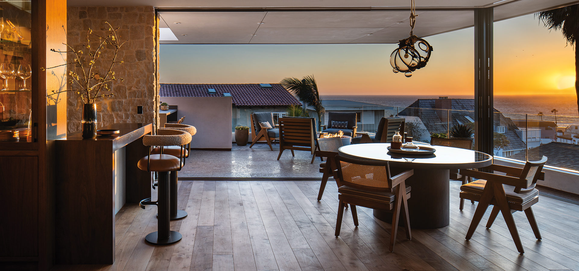 The kitchen, dining and family room are on the top floor of the home, along with a bar and a spacious deck with sprawling ocean views. “The choice of the dark, smoked mirror [behind the bar] was on purpose,” Lynn notes. “If we used a regular mirror, it would have been too bright with the reflection of the sun. That dark, smoked glass gives it some reflection and depth without it being too bright.”