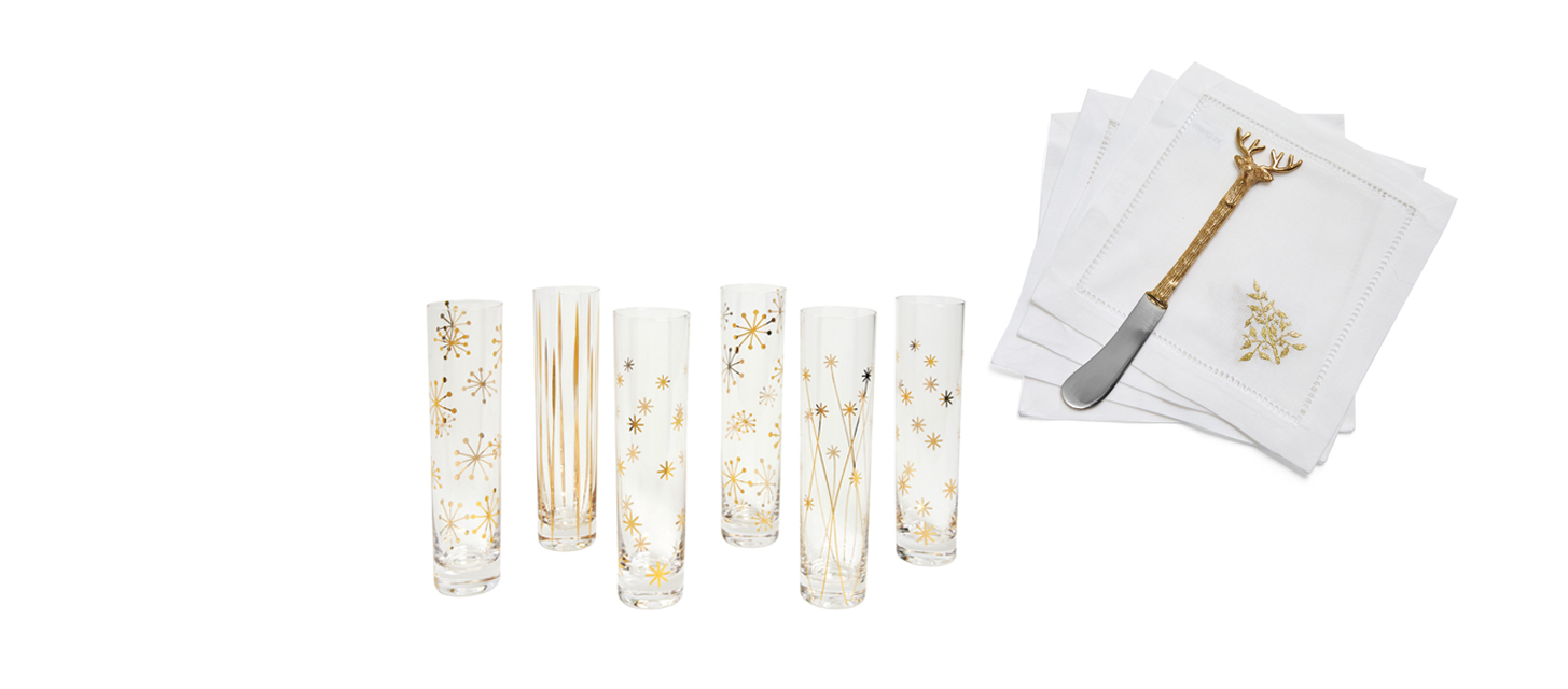 Hand-embroidered cocktail napkins, set of 4, and reindeer cocktail knife, $45 & $10