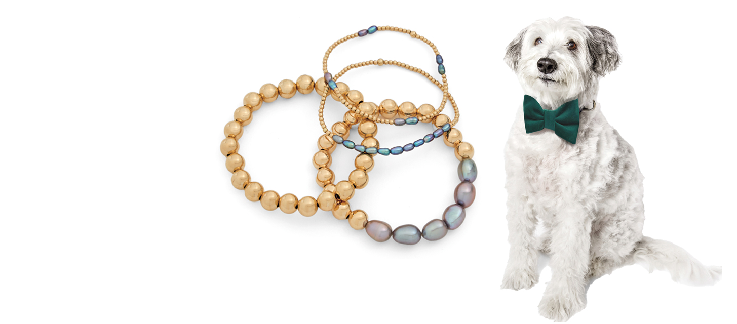 Karen Lazar bracelets: 8mm gold bead, $180, ember pearl stack, $160, shadow pearl, $158