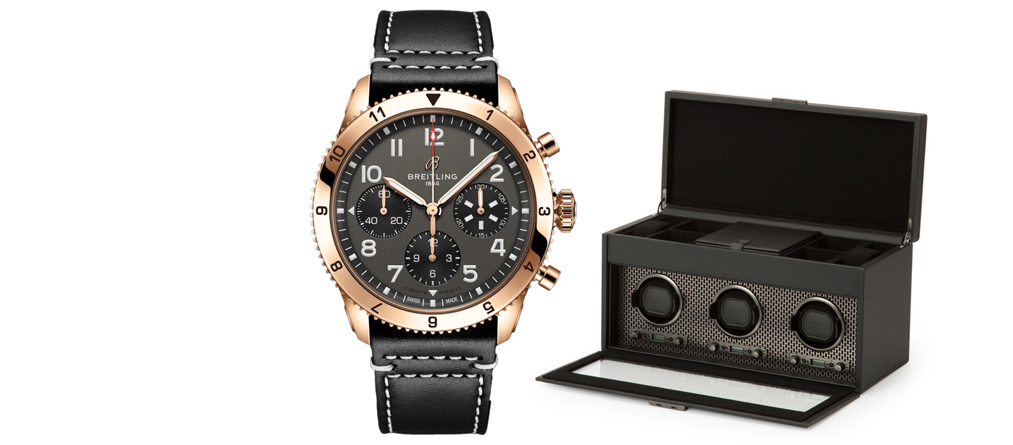 Breitling Classic AV1 Chronograph 42mm Pilots watch in 18K gold on black leather strap, $27,700