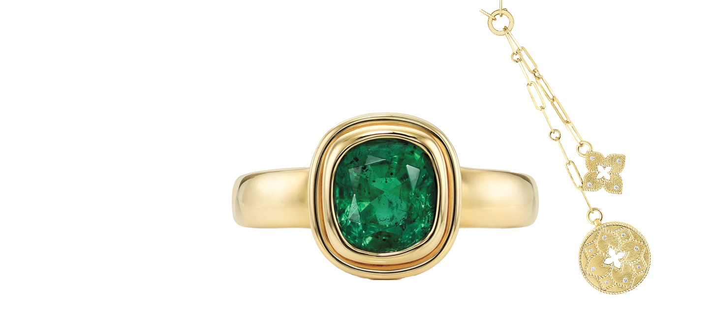 Morgan’s Collection custom 18K yellow gold cushion-cut emerald in double bezel ring, inquire for pricing