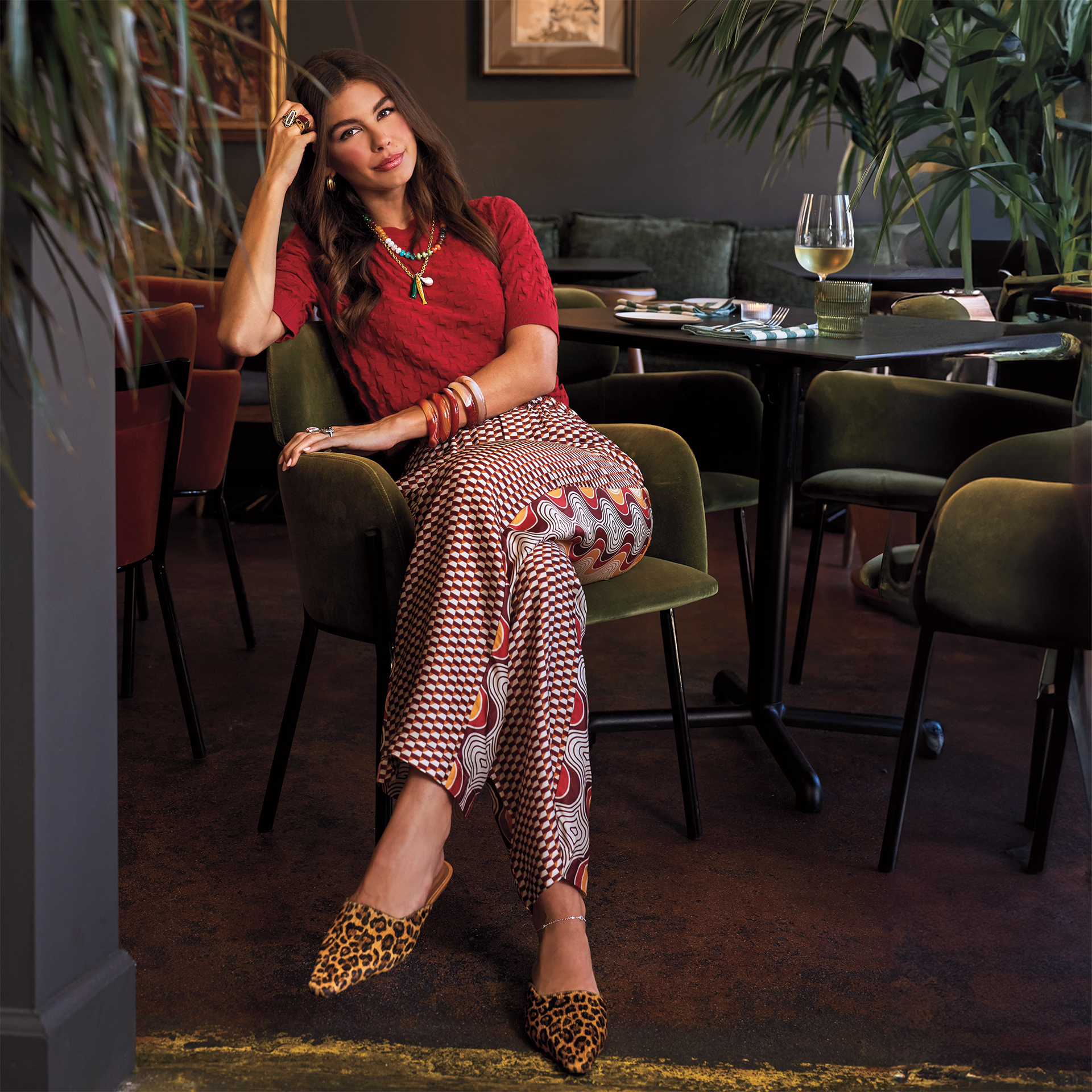 Beaded natural stone necklace, $36, long gold charm necklace by Chan Luu, $295, bronze hoop earrings by Ladha, $135; Gum Tree. Carnelian and green agate bangles, $60 each, vintage and semi-precious stone rings, $44 to $110 each; Right Tribe. Paprika 3D tee, $238; Margaret O’Leary. Sunset track pants by Me369, $258; Strand Section. Mocktail leopard print mules by Seychelles, $150; Details.