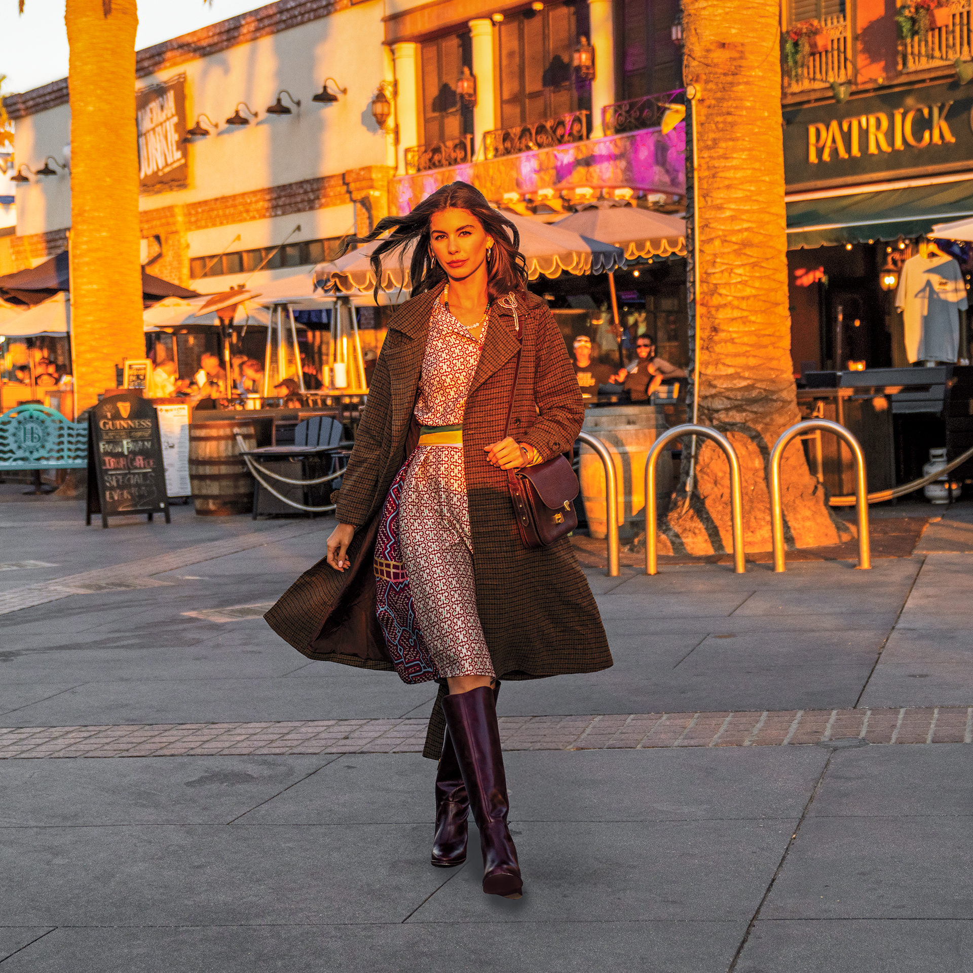 Checked coat by Rylee + Cru, $149; Waverly. Vintage crystal rhinestone brooch, $60, vintage scarf used as belt, $12; Right Tribe. Athena collar button-up dress by Me369, $359; Strand Section. Gold hoop earrings by JaxKelly, $48, beaded natural stone necklace, $36, blue sapphire bracelet by Sophie Deschamps, $120; Gum Tree. Chocolate leather bag by Soeur, $605; Margaret O’Leary. Mahogany knee-high boots by Vince Camuto, $250; Details.