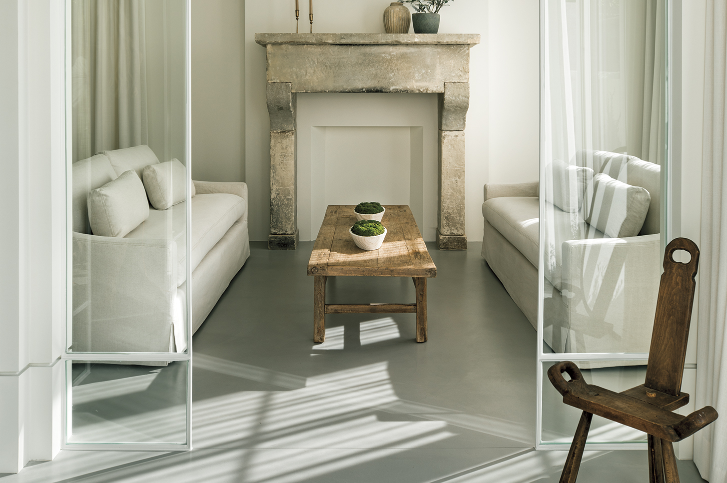 Neutral walls and simple upholstery let the architecture and key pieces speak.