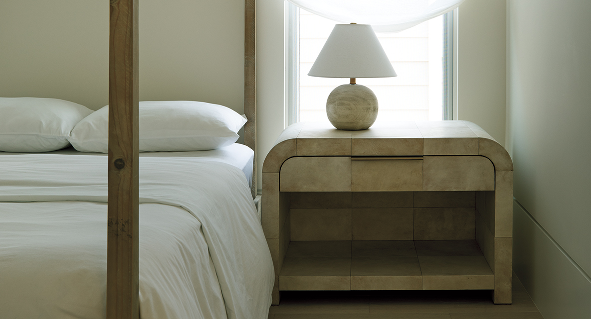 The spa-like home reads like an elegant study in whites and soft greys. The ethereal living room is awash in White Dove by Benjamin Moore and custom gauze drapes, and the upstairs primary bedroom is fashioned with a warm, ivory-hued Ophelia bed by Rove Concepts and nightstands crafted from reclaimed wood pilings sourced in San Francisco.