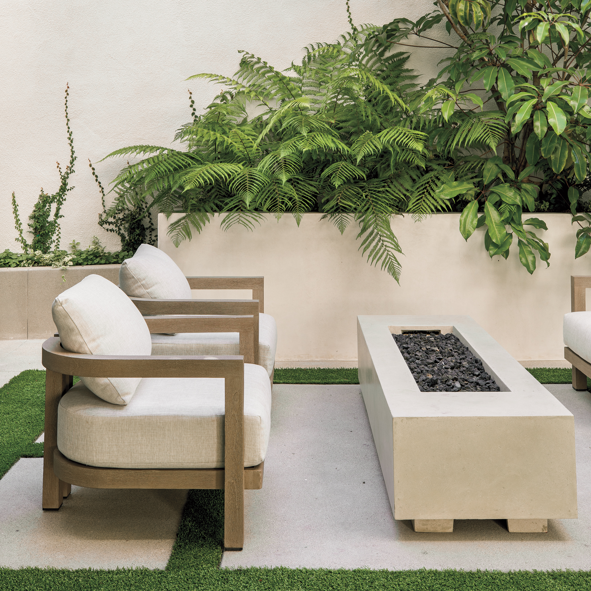 They also designed a courtyard—dotted with Portofino teak lounge chairs from RH and a firepit—that serves as a multipurpose zone for playing, throwing balls and lounging. “The one thing Taylor really wanted was a ‘California room’ where he could go and sit outside but still feel like it’s an extension of the interior,” explains Nicole.